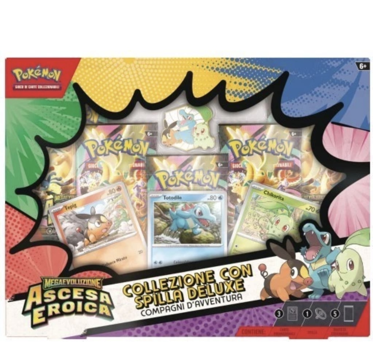 La collezione con spilla deluxe Compagni d’avventura dell’espansione Megaevoluzione – Ascesa Eroica del GCC Pokémon contiene: