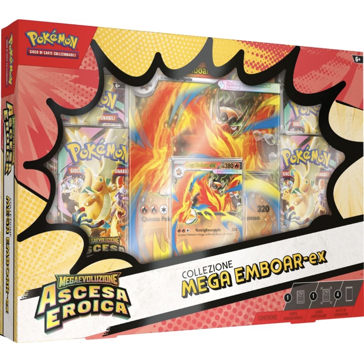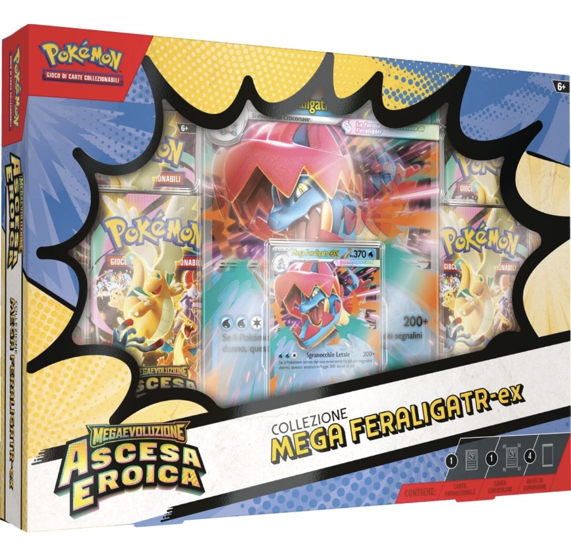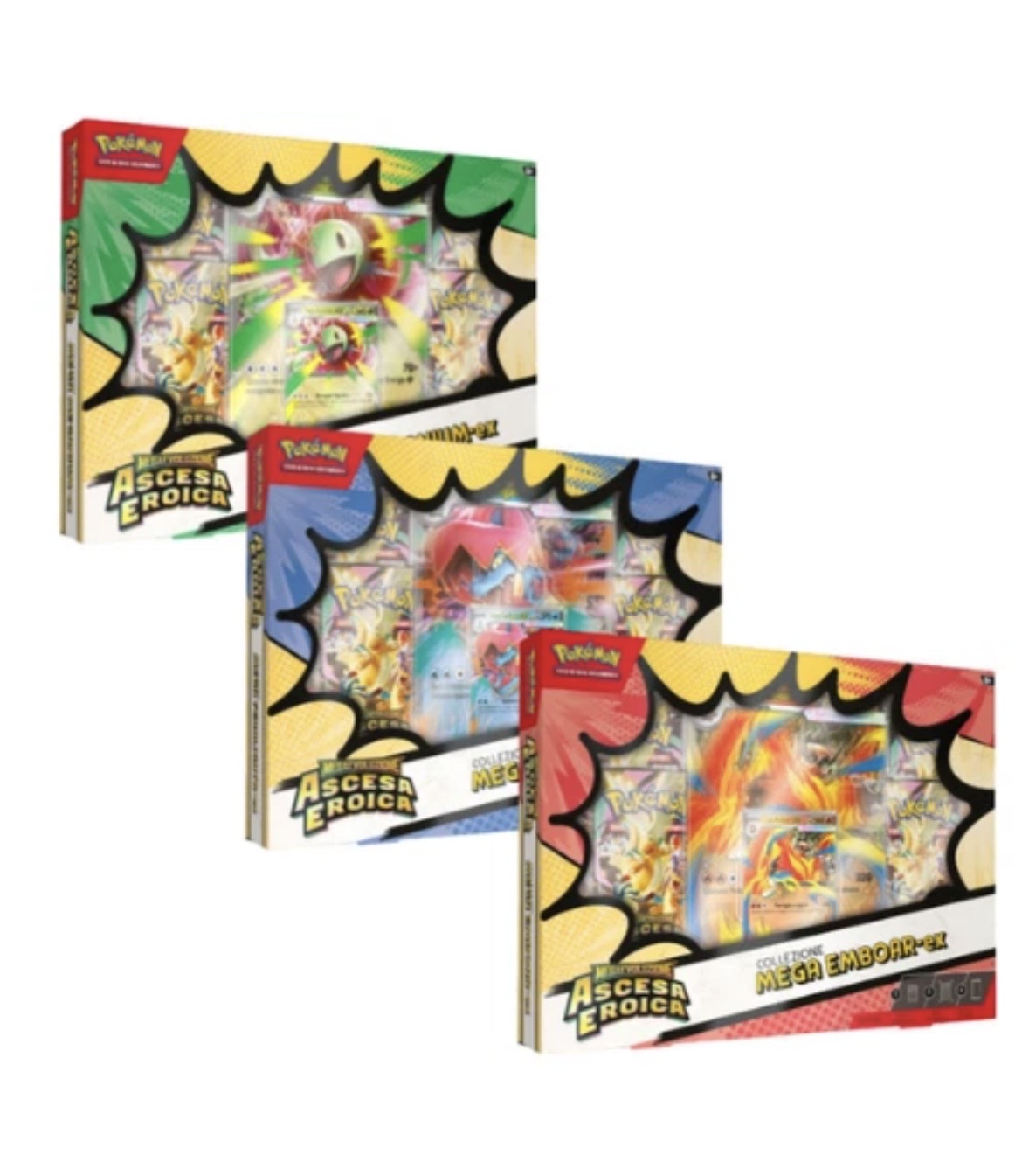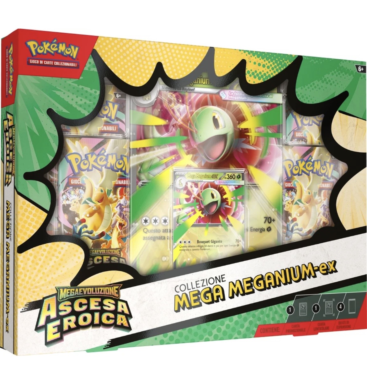 Scopri la potenza dei Pokémon completamente evoluti con le Collezioni Mega EX di Ascesa Eroica! Ogni box è dedicato a uno dei tre iconici starter finali: Emboar, Feraligatr o Meganium, pronti a dominare la tua collezione o il campo di gioco.