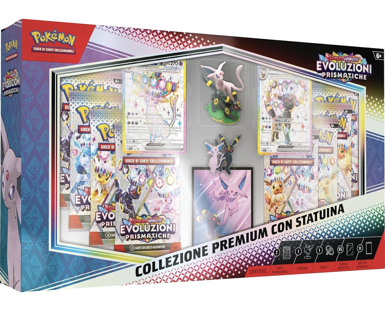 Fai vedere a tutti quanto ami Espeon, il Pokémon Sole, e Umbreon, il Pokémon Lucelunare, grazie a questa collezione premium con statuina dell’espansione Scarlatto e Violetto – Evoluzioni Prismatiche del GCC Pokémon!