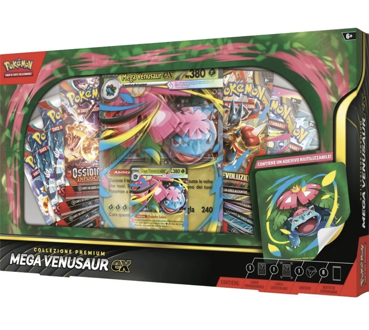 La Collezione Premium Mega Venusaur ex del GCC Pokemon contiene:nn- 1 carta promozionale olografica di Mega Venusaur exnn- 1 carta promozionale lenticolare gigante di Mega Venusaur exnn- 1 adesivo di Mega Venusaurnn- 8 buste di espansione del GCC Pokemon