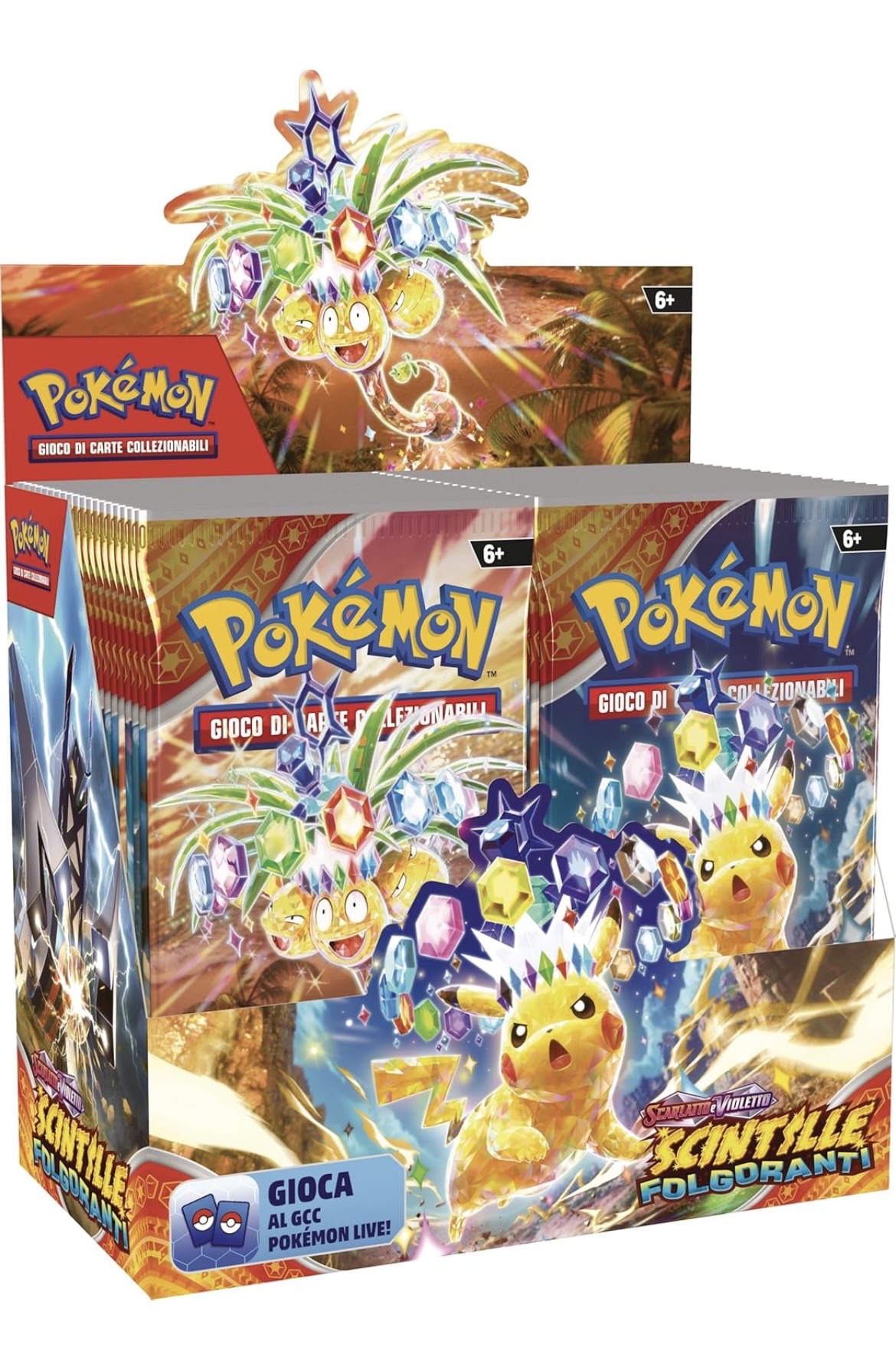 Contiene 36 buste dell’espansione Scarlatto e Violetto – Scintille Folgoranti del GCC Pokémon. Ogni busta di espansione contiene 10 carte da gioco e un’Energia base. Le carte variano a seconda delle buste.