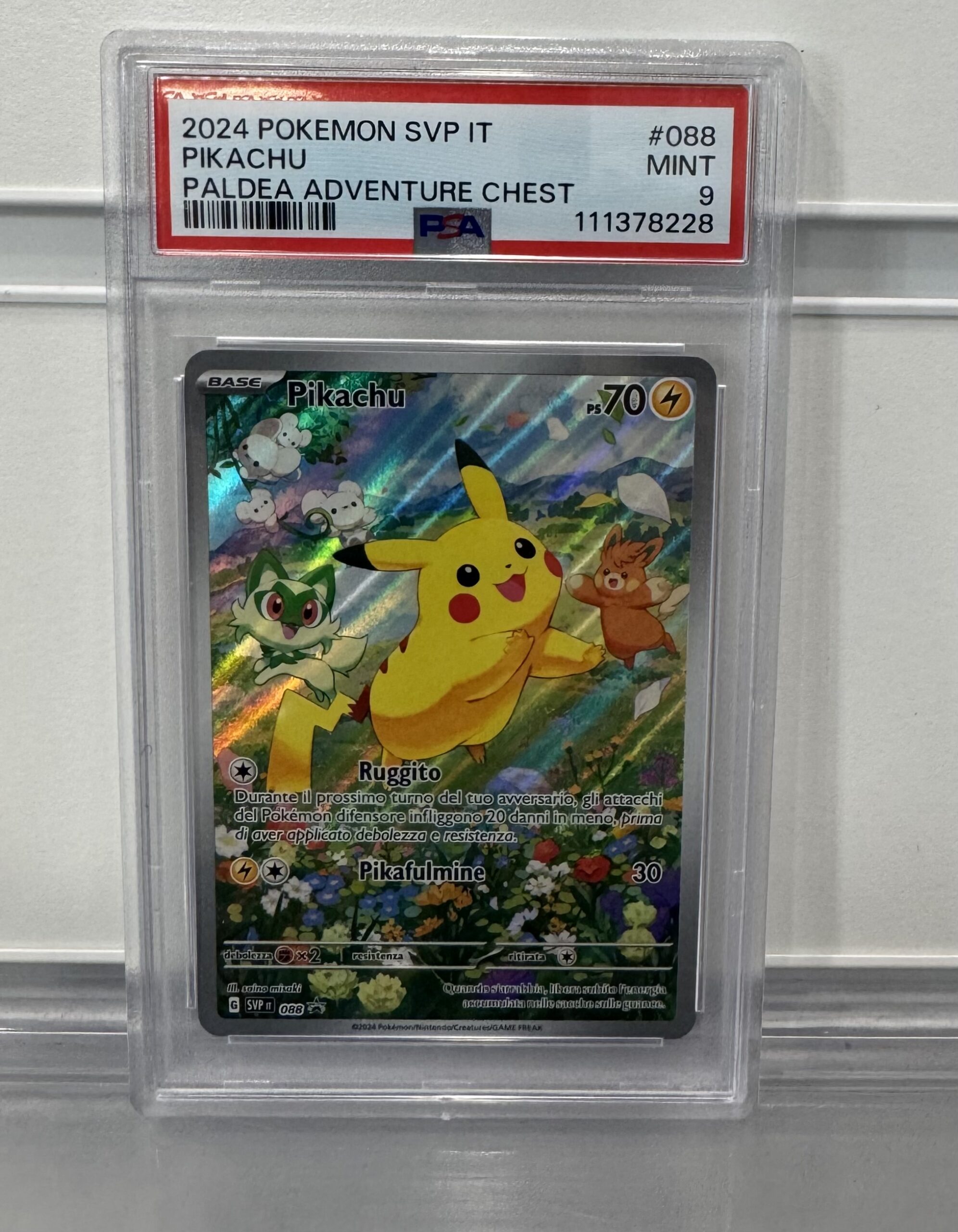 Celebra la magia di Pikachu con questa esclusiva carta promozionale italiana, proveniente dal Paldea Adventure Chest 2024 e certificata PSA 9 (Mint)! Raffigurata in compagnia di amici in un vivace campo fiorito, questa versione holo #088/SVP si distingue per la freschezza dell’artwork e l’elevato grado collezionistico. Perfetta per veri appassionati Pokémon e collezionisti di carte rare.