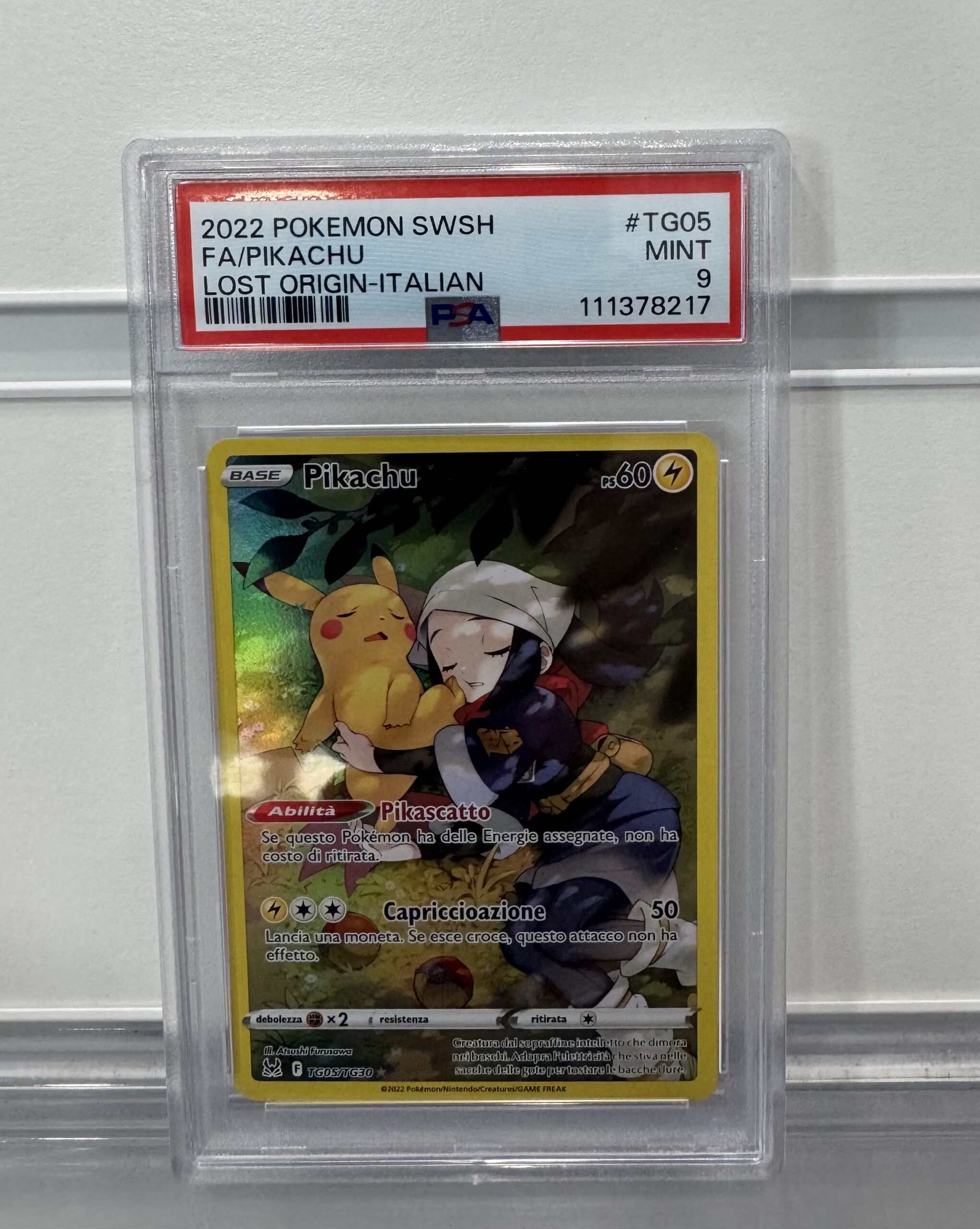 Questa card è una “Pikachu FA” proveniente dal set Lost Origin nella versione italiana, gradata PSA 9 (Mint), quindi perfetta per collezionisti esigenti e amanti delle carte Pokémon di alta qualità. La carta è Full Art, con un’illustrazione colorata e una finitura brillante che mette in risalto Pikachu accanto a un allenatore in un momento di relax. La valutazione Mint assicura condizioni quasi perfette, rendendola un pezzo ideale per investimento o aggiunta a una collezione di valore.